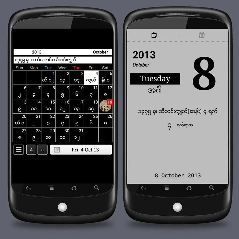 Android OS သုံးသူမ်ားအတြက္္္္္္္္္္္္္္္္္္္ မရွိမျဖစ္ေဆာင္ထားသင့္တဲ့ ျမန္မာႏွစ္တစ္ရာ ျပကၡဒိန္ကုိတင္ေပးလုိက္ပါတယ္။1901-2020 အထိကုိမိမိျပန္ၾကည့္လုိသမွ်ေန႕လရက္မ်ားကုိတိတိက်က်ေဖာ္ျပေပးႏိုင္ပါတယ္။အသုံးျပဳရလြယ္ကူျပီး ျမန္မာစာအတြက္မူ Root မေဖာက္ထားလည္း ၾကည့္ရႈႏုိင္မွာျဖစ္ပါတယ္။ဒါအျပင္ ျပကၡဒိန္ရဲ႕ ေနာက္ခံ Background,themes,font size မ်ားကုိလည္း မိမိစိတ္တုိင္းက် ျပဳဳျပင္ ႏုိင္ျပီး ေန႕ရက္ အလုိက္ ရက္ရာဇာ၊ျပသဒါးမ်ားကုိလည္း ေဖာ္ျပေပးထားပါတယ္။မိမိသူငယ္ခ်င္းေမြးေန႕မ်ားကုိလည္း ျပကၡဒိန္မွာ မွတ္ထားႏုိင္ျပီး ျမန္မာလေတြမွာရွိထားတဲ့ အားလပ္ရက္မ်ားကုိလည္း ျပေပးထားတာေၾကာင့္ Android OS သုံးသူတုိင္း ထည့္ထားသင့္တဲ့ အသုံး၀င္ ျမန္မာျပကၡဒိန္းေလးပါ။